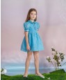Description | Girls stylish brocade and tulle dress by Le Mu. A green leaves embelishment detail on the collar. Brocade puff long sleeves with dark blue button detail give dress elegant feeling. On bottom of skirt, sky blue brocade with navy trim and lined in soft cotton for comfort. Fastens with a zip on the back and comes with a pearl hanger and Le Mu dress bag. |