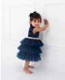 A Le Mu baby girl, navy blue dress made with luxury soft satin with dark blue tulle. A yellow velvet belt with handmade flora decorate on the waist. Dark blue tulle give the dress full of layers. The sleeveless knee length dress and is lined in satin backed in soft cotton. It fastens with a zip on the back and comes with a pearl hanger, matching knickers and Le Mu dress bag