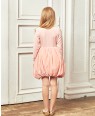 An elegant, special occasion dress by Le Mu, made in luxury soft pink velvet with jersey fabric. This velet long sleeve dress is lined in satin backed in soft cotton, and it fastens with a zip on the back. Comes with a pearl hanger and Le Mu dress bag